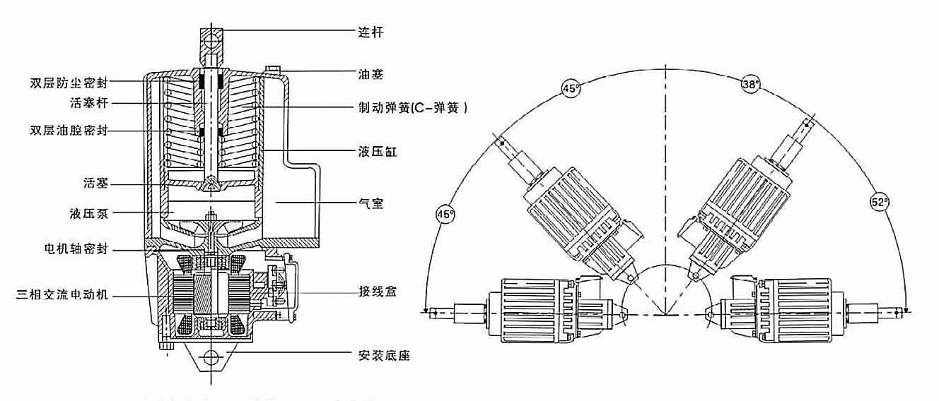 緩沖彈簧:(僅適用于短行程)主要調(diào)節(jié)制動過程。緩沖制動非周期瞬變過程,使制動平穩(wěn),它代替推桿連接塊裝在活塞桿上,不改變推動器的行程。